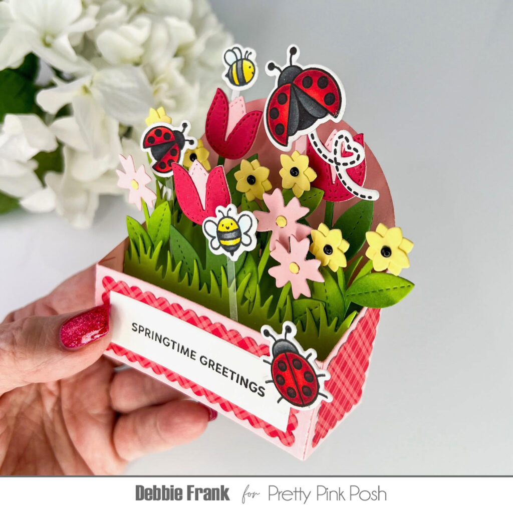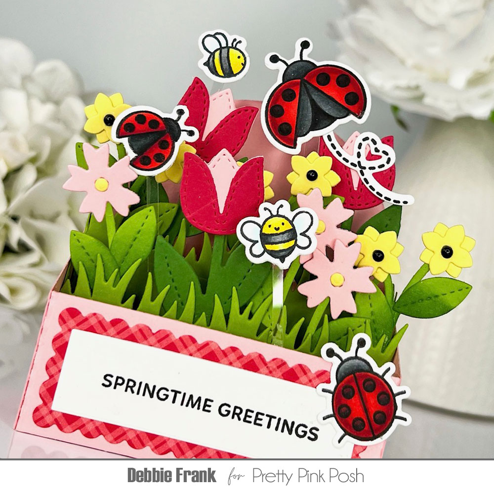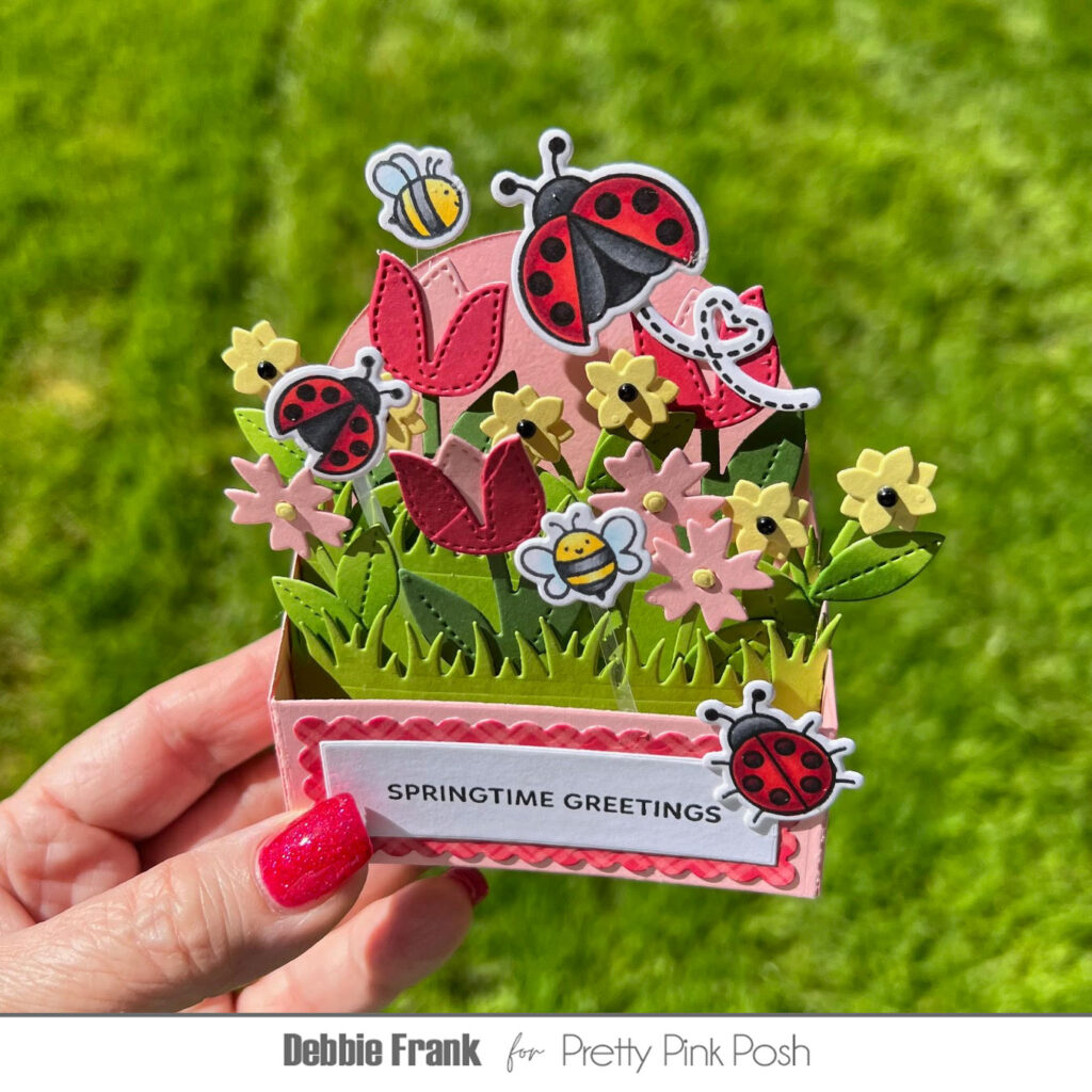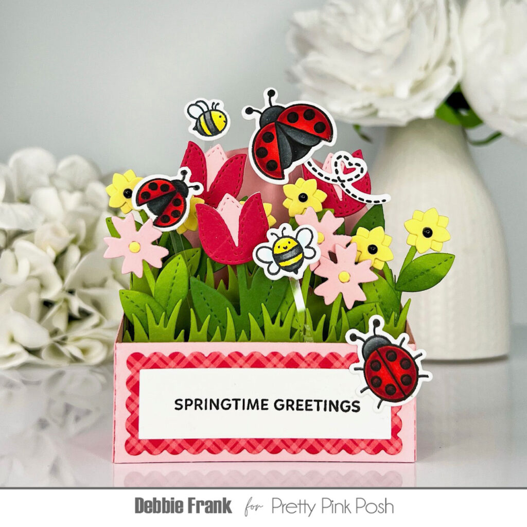 Hi friends, Debbie here with the adorable Lovely Ladybug stamp set from Pretty Pink Posh! I’m definitely ready for summer with all the flowers blooming and the cute flying insects! Bees are way cuter on paper than for real, though!
